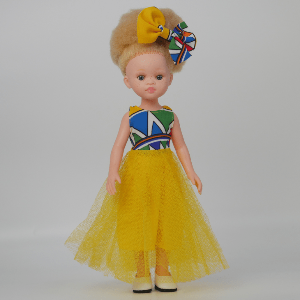 Ses vêtements, confectionnés à la main en Afrique du Sud, subliment son style. Elle porte une robe en wax, associée à un tulle aérien qui apporte volume et élégance. Les motifs colorés du wax — jaune, orange ou rose selon les variantes disponibles — rendent chaque modèle unique. L’ensemble est complété par un accessoire assorti pour cheveux et de jolies ballerines, pour une allure à la fois moderne et culturelle.